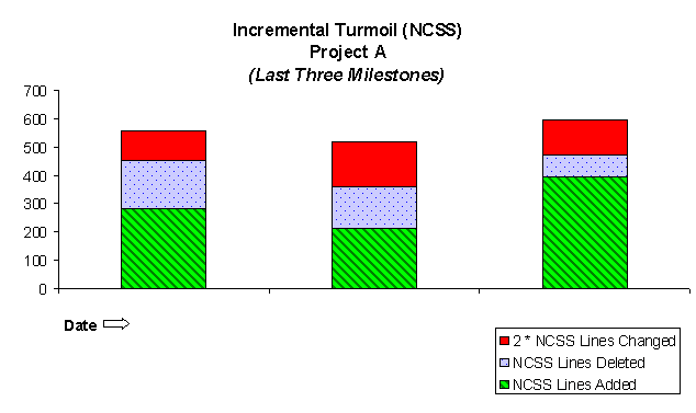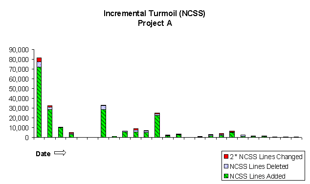 Incremental turmoil (Figure 8) is a differential between the times plotted. It is useful for measuring the stability of the code and for tracking progress toward closure. We always see a pattern of a very large number of initial changes followed by some oscillation between periods of large and small changes. We don't expect the entire product to be ready for testing at once, and incremental turmoil reflects the arrival of features over time as they are sequenced into the release according to our plans.
