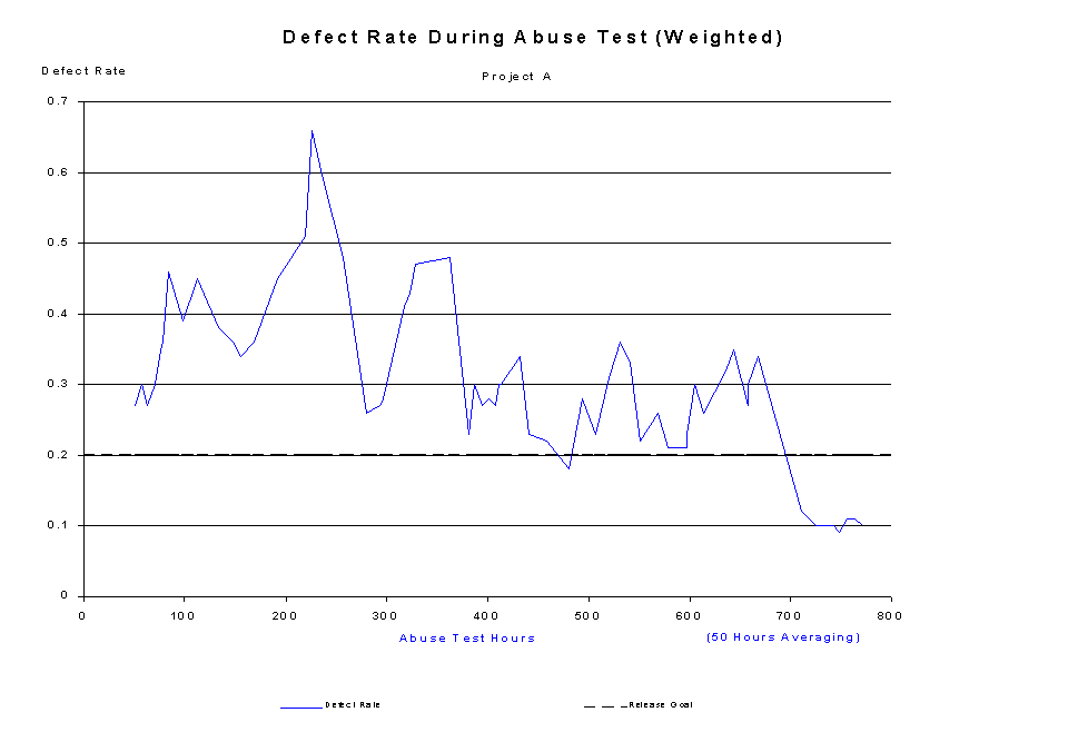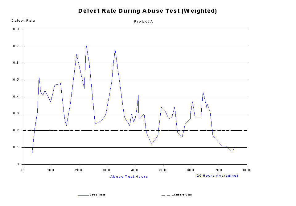 At Agilent Technologies, we measure the defect rate of our software. It is similar to failure intensity, but while Musa defines failure intensity as "the derivative of the mean value function with respect to time[,]... an instantaneous value," [note 7] we define the defect rate to be a moving average [note 8] with respect to a specified period of time. For over a decade we have experimented with what that period of time should be. We've used rates of between 20 and 50 percent of the total test time. For instance, on one project with 180 hours of abuse test time, we used a 40-hour moving average; on another project with just over 2,000 hours of test time, we measured the rate for a 1,100-hour moving average. We also begin with a smaller period (e.g. 10 hours) to get data early in the test cycle. Figure 1, Figure 2, and Figure 3 show the difference for one project using 25, 50, and 100-hour moving averages.