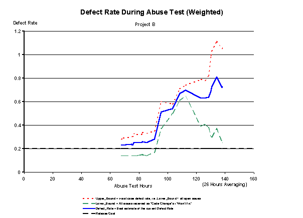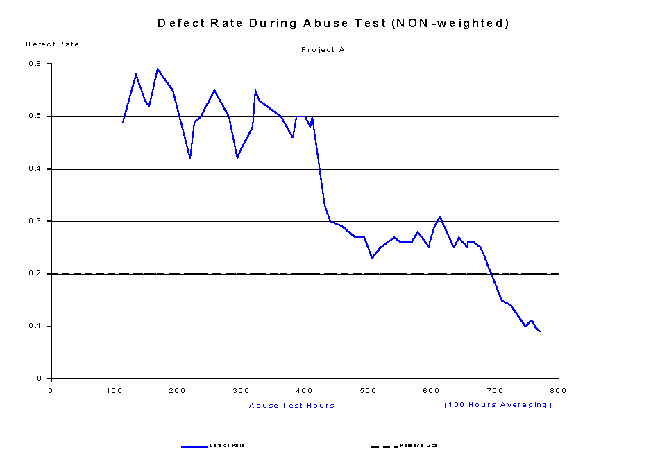 As was mentioned in the History section, our release goal is a rate of 0.2 defects found per time period specified by the moving average. Originally, we chose 0.1 based on the literature in the late 1980's [note 9]. Our experience later convinced us that 0.2 was sufficient, and we've kept it because we're satisfied with the results it gives us.