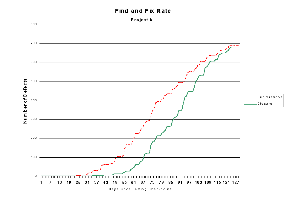 While we use Figure 5 to estimate our progress, Figure 6 proactively helps us balance resources between finding new defects and fixing those that already have been found. It's a straightforward metric. Whenever the solid green line creeps too far away from the broken red line, we slow down or cease our testing effort while the development team catches up with repairs. When we first started measuring this phenomenon, we ceased testing altogether. We then learned that we didn't have to do that. We use a more active feedback system to keep some testers busy while we slowly close the gap. Mark Lambuth aptly calls this a "rheostat" in the test system. It takes advantage of queuing theory to optimize throughput. When we notice that defects have a higher in a particular set of features, we suspend testing on those features while the team fixed the code, and we concentrate on testing other features.