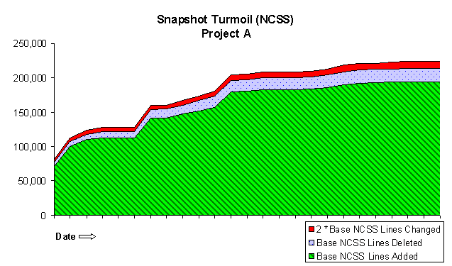 We define turmoil to be a measure of code stability. We calculate the turmoil of a release for the first time by identifying all source files at a point in time early in the development cycle. For subsequent data points, each file is compared against the previous version, and the number of non-commented source statements (NCSS) added, deleted, and changed is counted. The number of NCSS changed is then doubled. The rationale is that a changed line can be represented by the transformation: delete the old line, add the new one.