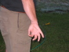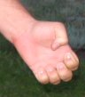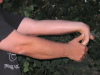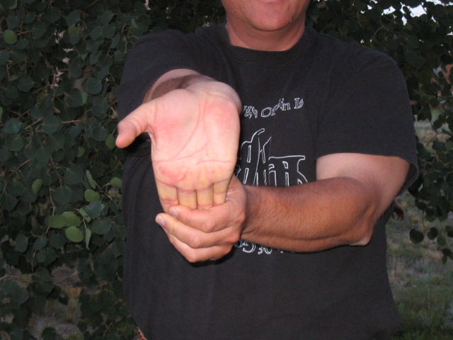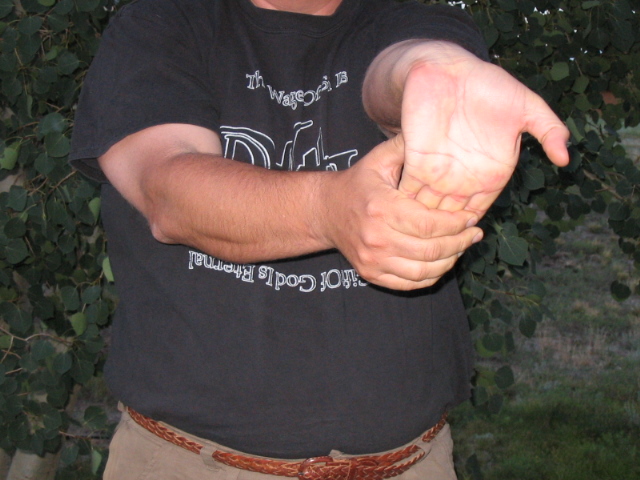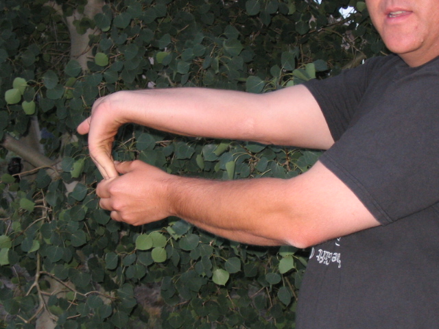 2. Again with your arms at your sides in a neutral position, touch your index fingers to your thumbs and turn your palms so they face behind you, then turn them on around to the outside. Lock your elbows. Twist your palms out as far as you can, and hold it for 5 seconds. You should feel the stretch in your arms. Relax, and repeat. Relax, repeat a third time. That's 3 sets of 5 seconds each. | ||